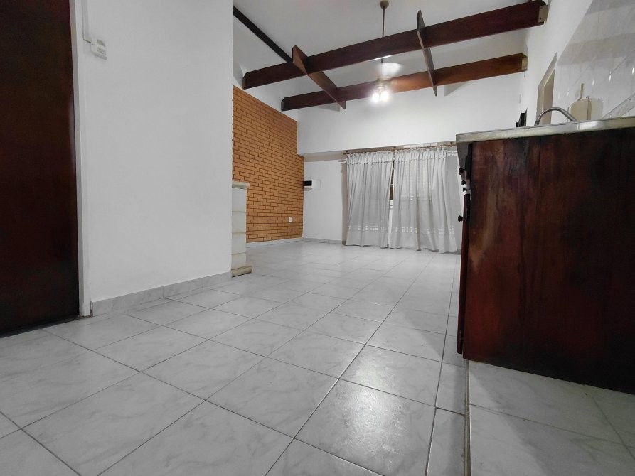 Cocina Comedor integrada equipada con Bajo mesada en Algarrobo laqueado, paredes revestidas de ladrillo a la vista, hogar a gas y piso ceramico.-